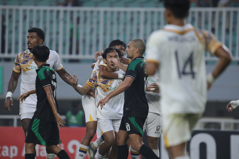 Luthfi Kamal setelah mencetak gol yang dianulir usai tinjauan VAR dalam laga kontra PSMS di Stadion Pakansari, Minggu (5/4).